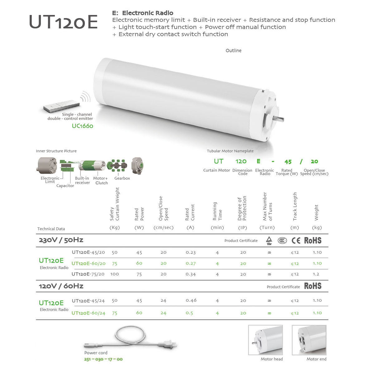Memorized Limit+Integrated Radio Control+Obstruction Detection+Light touch-start+Manual Override+The third limit position+Compatible with dry contact switch function.